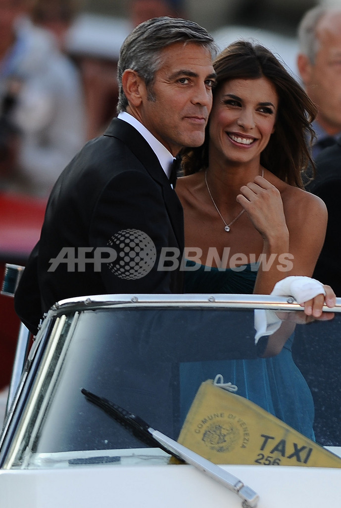 イタリア北部ベネチア(Venice)で開催中の第66回ベネチア国際映画祭(Venice International Film Festival)で8日、コンペ外作品『The Men Who Stare at Goats』が上映され、出演している米俳優ジョージ・クルーニー(George Clooney)が恋人のイタリア人女優エリザベッタ・カナリス(Elisabetta Canalis)とともに登場した。写真は、上映会場にボートで登場したクルーニー(左)とカナリス(2009年9月8日撮影)。(c)AFP/Filippo Monteforte