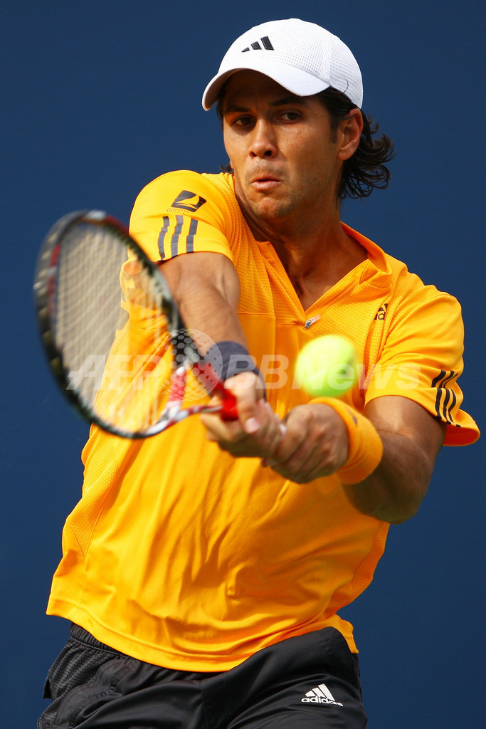 ジョコビッチは準決勝で大会第1シードのロジャー・フェデラー(%%Roger Federer%%、スイス)と対戦する。写真はリターンショットを放つフェルナンド・ベルダスコ。(2009年9月9日撮影)(c)AFP/Getty Images/Julian Finney
