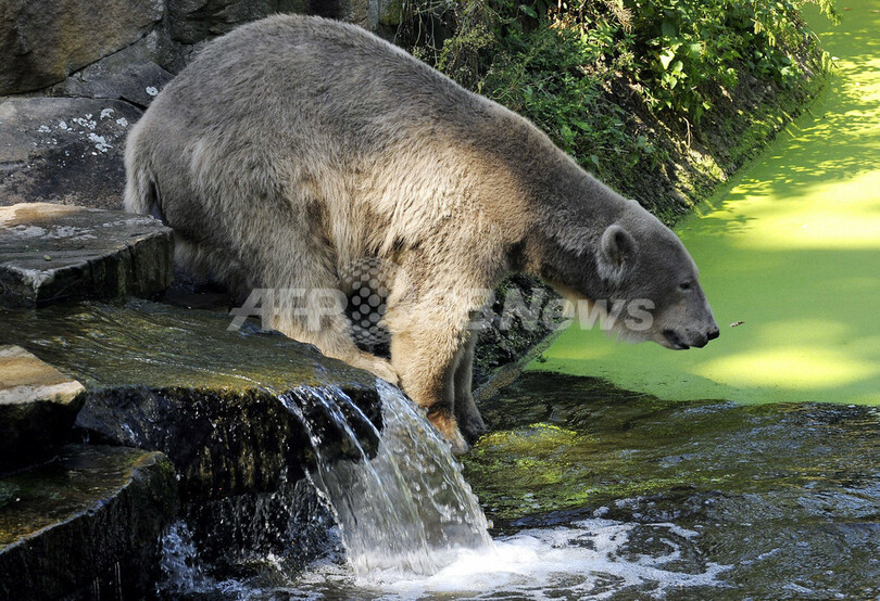 写真は、ベルリン動物園の屋外施設で水浴びをしようとするクヌート(2009年9月8日撮影)。(c)AFP/DDP/THEO HEIMANN