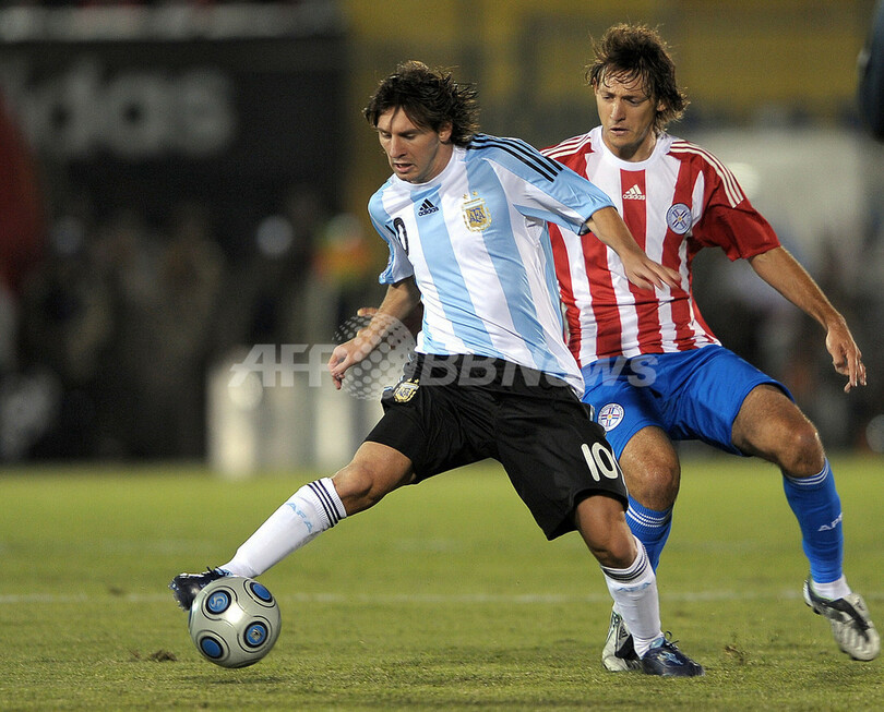 敗れたアルゼンチンは、本大会出場を懸けた大陸間プレーオフで北中米カリブ海地区予選4位チームと戦うこととなる、5位に後退した。写真はパラグアイのエドガル・バレット(%%Edgar Osvaldo Barreto%%、右)のを背にしてボールをキープするアルゼンチンのリオネル・メッシ(%%Lionel Messi%%、左)。(2009年9月9日撮影)(c)AFP/ALEJANDRO PAGNI