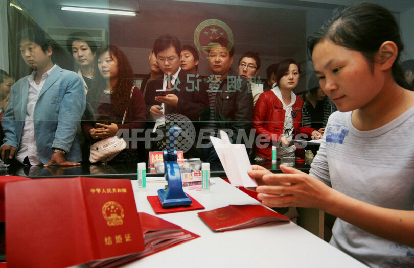 【9月10日 AFP】中国で縁起が良いとされる「久」の字と発音が同じ「9」が3つ並んだ9日、「2009年9月9日」付けの婚姻証明書を手に入れようと、数万組のカップルが婚姻届を出すため中国各地の登記所に殺到した。
