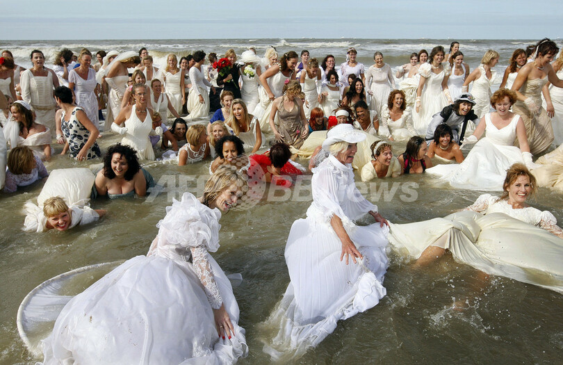 【9月10日 AFP】オランダ南西部スヘフェニンゲン(Scheveningen)で9日、女性たちがウエディングドレスを着て海に入るイベントが行われた。これは、カメラマンのMelanie Rijkersさんが、インターネット上でたまたま見た野外でウエディングドレス姿の写真撮影を行う米国の「Trash the dress」と呼ばれる行為から着想を得て始めたもの。一度着たウエディングドレスをもう一度楽しもう、というアイディアが込められている。(c)AFP