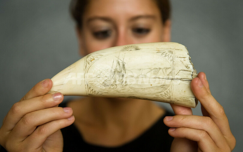 写真は、英ロンドンの中心街にある競売大手ボナムズ(Bonhams)で、クジラの歯を持つ女性。(c)AFP/Leon Neal