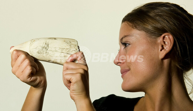 写真は、英ロンドンの中心街にある競売大手ボナムズ(Bonhams)で、クジラの歯を持つ女性。(c)AFP/Leon Neal