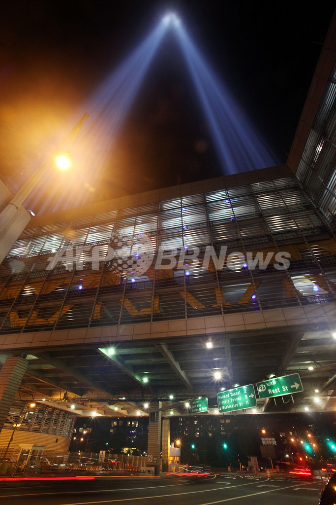 ニューヨークの世界貿易センタービル跡地では11日夜、犠牲者をしのんで、かつてそびえていた2つの高層ビルを模したライトアップが行われる。(c)AFP/Sara Hussein
