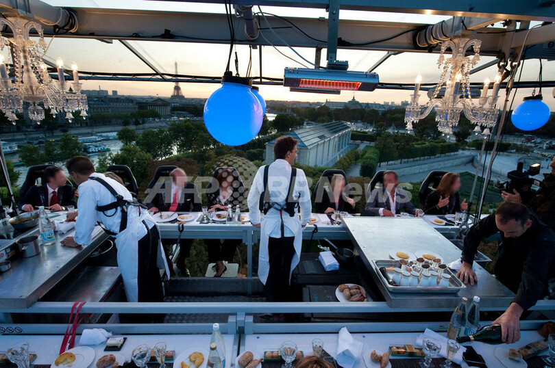 ニュース ライフ こぼれ話 パリ上空50メートルで「空中ディナー」 2009年9月12日 19:11 発信地:パリ/フランス [ ヨーロッパ フランス ] このニュースをシェア ‹ › ❮ 2/12 ❯ パリ(Paris)で開催された空中ディナーイベント「Dinner in the Sky」(2009年9月11日撮影)。(c)AFP/MARTIN BUREAU 画像作成中 ! 【9月12日 AFP】パリ(Paris)で11日、上空50メートルにクレーンでつり下げられたテーブルで食事を楽しむ空中ディナーイベント「Dinner in the Sky」が始まった。イベントは5日間の日程で、1回につき22人ずつがディナーを楽しむことができる。初日の11日にはエリゼ宮(Elysee Palace)や有名ホテルのシェフらが、空中ディナーを楽しんだ。主催は「Cuisine Creative」誌。(c)AFP ライフ 一覧へ> メディア・報道関係・法人の方向け 写真・動画 購入のお問合せ>