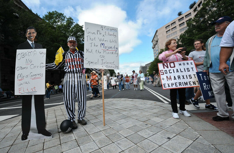 デモ行進の出発点となったホワイトハウス(White House)に近いフリーダム・プラザ(Freedom Plaza)には大勢の人が集まり、予定された午前11時30分より早くスタートした。参加者は手製のポスターなどを掲げ、オバマ大統領が進める医療改革などへの反対を叫んだ。