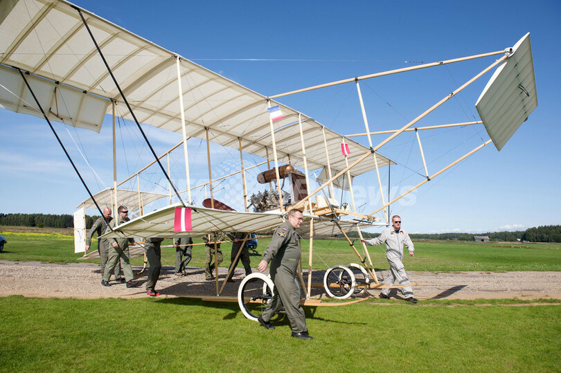 フランスの飛行士・航空機設計者のアンリ・ファルマン(Henri Farman)が作成したオリジナルの図面を元に製作したもの。図面はGuntars Senkansさんら村の航空愛好家グループが、15年かけてラトビアや隣国ロシアの文書保管所を探して見つけ出した。(c)AFP