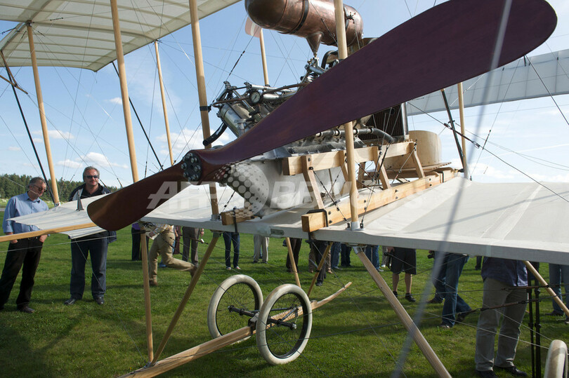 【9月13日 AFP】ラトビアの首都リガ(Riga)から約30キロのAdaziの飛行場で12日、1910年製のファルマン4型機(Farman 4)の複製が公開された。