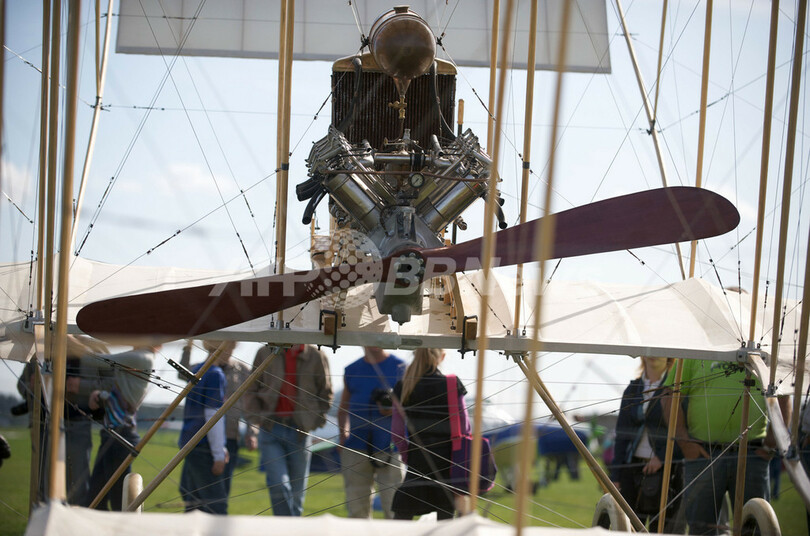 【9月13日 AFP】ラトビアの首都リガ(Riga)から約30キロのAdaziの飛行場で12日、1910年製のファルマン4型機(Farman 4)の複製が公開された。