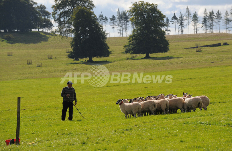 【9月13日 AFP】13日、英イングランド北西部カンブリア(Cumbria)州ペンリス(Penrith)近郊のローサー(Lowther)で開催中の「国際牧羊犬競技会(International Sheepdog Trials)」最終日の審査。アイルランド・ドネガル(Donegal)から参加した羊飼いパトリック・マクゴールドリック(Patrick McGoldrick)さんの牧羊犬「グレン」も、2グループに分けられた計20匹の羊を追い、5匹ずつのグループに分ける技した。(c)AFP