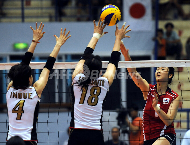 第15回アジア女子バレーボール選手権大会(%%the 15th Asian Senior Women's Volleyball championship%%)3位決定戦、日本対韓国。試合は日本が25-16、25-15、25-18で勝利し、大会を3位で終えた。写真は日本の井上香織(%%Kaori Inoue%%、左)と坂下麻衣子(%%Maiko Sakashita%%)のブロックに対しスパイクを打つ韓国のキム・ミンジ(%%Kim Min-Ji%%、右)。(2009年9月13日撮影)(c)AFP/HOANG DINH Nam