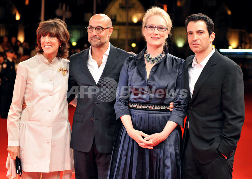 フランス北西部のリゾート地ドービル(Deauville)で4日から13日まで第35回ドービル・アメリカ映画祭(Deauville American Film Festival)が開催され、期間中多くのハリウッドスターが姿を見せた。写真は、映画『ジュリー&ジュリア(Julie & Julia)』の上映会に出席した(左から)ノーラ・エフロン(Nora Ephron)監督、スタンリー・トゥッチ(Stanley Tucci)、メリル・ストリープ(Meryl Streep)、クリス・メッシーナ(Chris Messina、2009年9月5日撮影)。(c)AFP/MYCHELE DANIAU