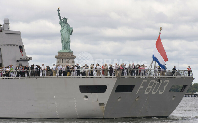 写真は、ニューヨーク湾で「自由の女神(Statue of Liberty)」像の前を通過するオランダ海軍フリゲート艦「HNMLS Tromp」の乗客(2009年9月13日撮影)。(c)AFP/DON EMMERT