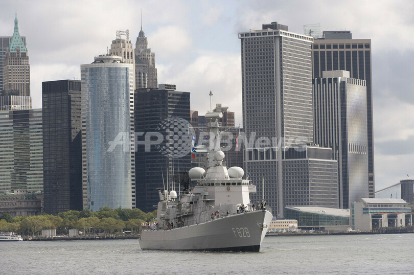 写真は、ニューヨーク湾でマンハッタン島付近を航行するオランダ海軍フリゲート艦「HNMLS Van Speijk」(2009年9月13日撮影)。(c)AFP/DON EMMERT