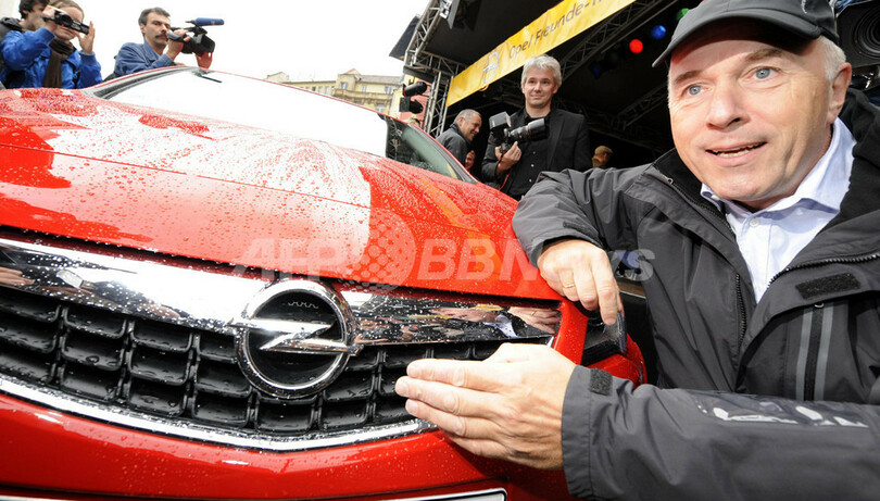 第63回フランクフルト国際モーターショー(International Motor Show、IAA)が17日、ドイツ・フランクフルト(Frankfurt)で開幕する。今年は出展されるうち82車種が世界初公開となる。。写真は、オペル・アストラ(Opel Astra)を紹介するGMヨーロッパのカール・ピーター・フォースター(Carl-Peter Forster)社長(2009年9月14日撮影)。(c)AFP/DDP/THOMAS LOHNES