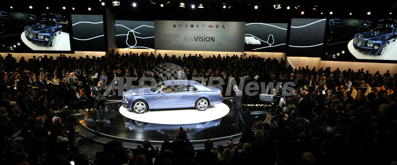 第63回フランクフルト国際モーターショー(International Motor Show、IAA)が17日、ドイツ・フランクフルト(Frankfurt)で開幕する。今年は出展されるうち82車種が世界初公開となる。写真は、会場でベントレー・ミュルザンヌ(Bentley Mulsanne)を紹介するGMヨーロッパのカール・ピーター・フォースター(Carl-Peter Forster)社長(2009年9月14日撮影)。(c)AFP/DDP/THOMAS LOHNES