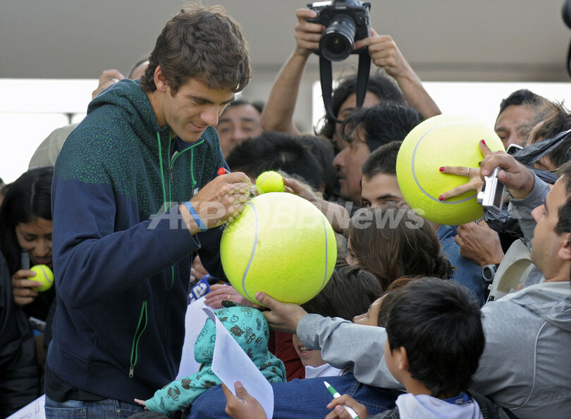 全米オープンテニス(%%The US Open Tennis Championships 2009%%)男子シングルスで優勝したファン・マルティン・デルポトロ(%%Juan Martin Del Potro%%)が16日、母国アルゼンチンに凱旋帰国を果たした。写真はブエノスアイレス(Buenos Aires)のエセイサ国際空港(Ezeiza International Airport)でファンのサインに応じるファン・マルティン・デルポトロ。(2009年9月16日撮影)(c)AFP/JUAN MABROMATA