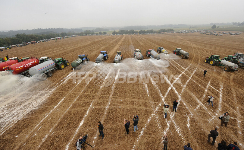 【9月17日 AFP】ベルギー南部のシネ(Ciney)で16日、酪農生産者たちが畑に300万リットルの牛乳をまき散らして、牛乳の価格急落に抗議した。