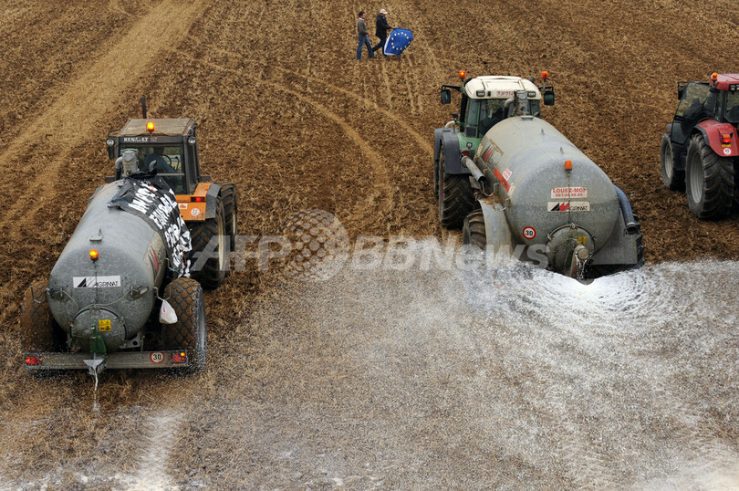 【9月17日 AFP】ベルギー南部のシネ(Ciney)で16日、酪農生産者たちが畑に300万リットルの牛乳をまき散らして、牛乳の価格急落に抗議した。