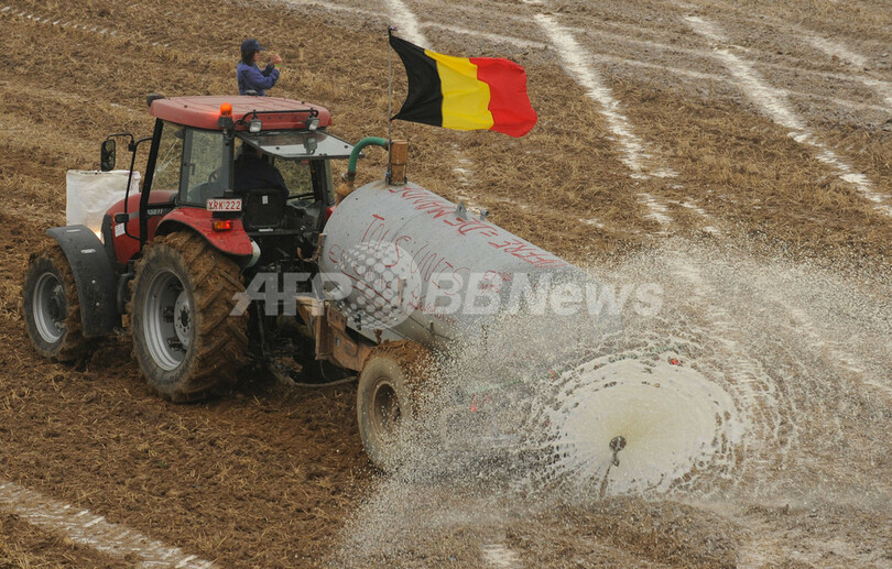 【9月17日 AFP】ベルギー南部のシネ(Ciney)で16日、酪農生産者たちが畑に300万リットルの牛乳をまき散らして、牛乳の価格急落に抗議した。