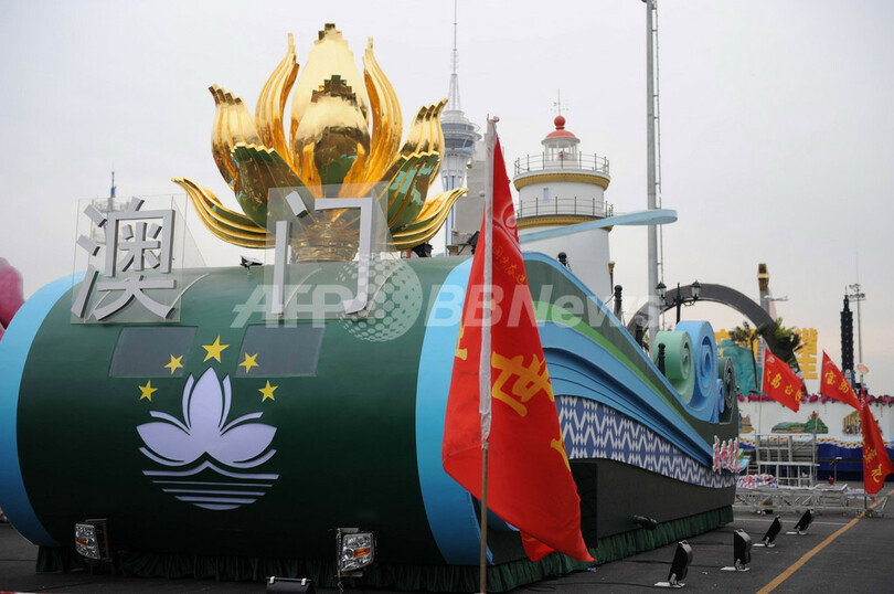 建国60周年の国慶節(建国記念日)を迎える10月1日、中国・北京(Beijing)では大規模な軍事パレードや山車行列などが予定されている。写真は北京市内で準備されるマカオ(Makau)特別行政区の旗を掲げた山車(2009年9月16日撮影)。(c)AFP