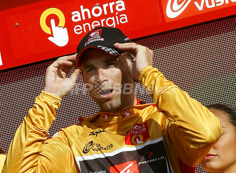 ケースデパーニュ(%%Caisse d’Epargne%%)のアレハンドロ・バルベルデ(%%Alejandro Valverde%%、スペイン)は、ミラーと36秒差の36分29秒を記録しステージを7位で終え、合計タイムを84時間10分32秒として総合首位を守った。写真は総合首位を守り、表彰台で喜ぶケースデパーニュのアレハンドロ・バルベルデ。(2009年9月19日撮影)(c)AFP/JAIME REINA