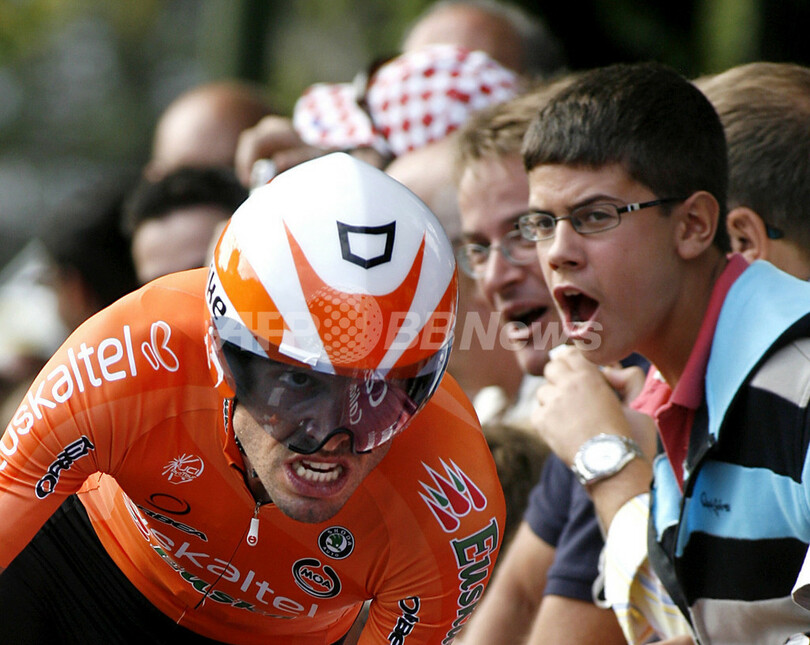 ケースデパーニュ(%%Caisse d’Epargne%%)のアレハンドロ・バルベルデ(%%Alejandro Valverde%%、スペイン)は、ミラーと36秒差の36分29秒を記録しステージを7位で終え、合計タイムを84時間10分32秒として総合首位を守った。写真は35分58秒でステージを2位で終えたエウスカルテル・エウスカディ(%%Euskaltel-Euskadi%%)のサムエル・サンチェス(%%Samuel Sanchez%%)。(2009年9月19日撮影)(c)AFP/JAIME REINA