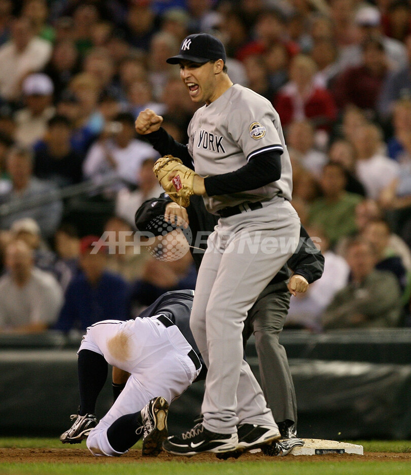 09MLB、シアトル・マリナーズ(%%Seattle Mariners%%)のイチロー(%%Ichiro Suzuki%%)は18日、ニューヨーク・ヤンキース(%%New York Yankees%%)戦に1番・右翼で先発出場し、9回に逆転サヨナラ2点本塁打を放つなど5打数4安打2打点を記録した。試合はマリナーズが3-2でサヨナラ勝ちを収めた。写真はけん制でアウトになったマリナーズのイチロー(左)と歓喜するヤンキースのマーク・テシェーラ(%%Mark Teixeira%%)。(2009年9月18日撮影)(c)AFP/Getty Images/Otto Greule Jr