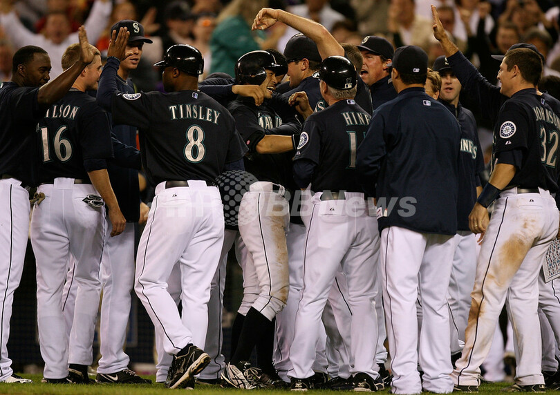 09MLB、シアトル・マリナーズ(%%Seattle Mariners%%)のイチロー(%%Ichiro Suzuki%%)は18日、ニューヨーク・ヤンキース(%%New York Yankees%%)戦に1番・右翼で先発出場し、9回に逆転サヨナラ2点本塁打を放つなど5打数4安打2打点を記録した。試合はマリナーズが3-2でサヨナラ勝ちを収めた。写真はサヨナラ2点本塁打を放ち、チームメイトに祝福されるマリナーズのイチロー。(2009年9月18日撮影)(c)AFP/Getty Images/Otto Greule Jr