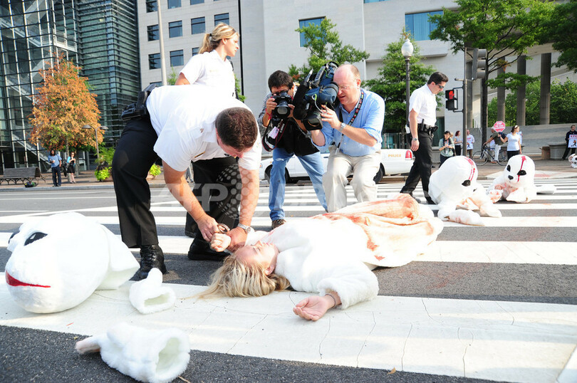 【9月19日 AFP】バラク・オバマ(Barack Obama)米大統領がカナダのスティーブン・ハーパー(Stephen Harper)首相と会談した16日、ワシントンD.C.(Washington D.C.)のペンシルベニア通り(Pennsylvania Avenue)のカナダ大使館前では、カナダのアザラシ漁に反対する国際動物愛護団体「動物の倫理的扱いを求める人々の会(People for the Ethical Treatment of Animals、PETA)」が抗議活動を展開。「ハーパー、アザラシ殺しを止めろ」などと書いたプラカードを掲げ、血まみれの赤ちゃんアザラシの着ぐるみを着てパフォーマンスを行った。(c)AFP