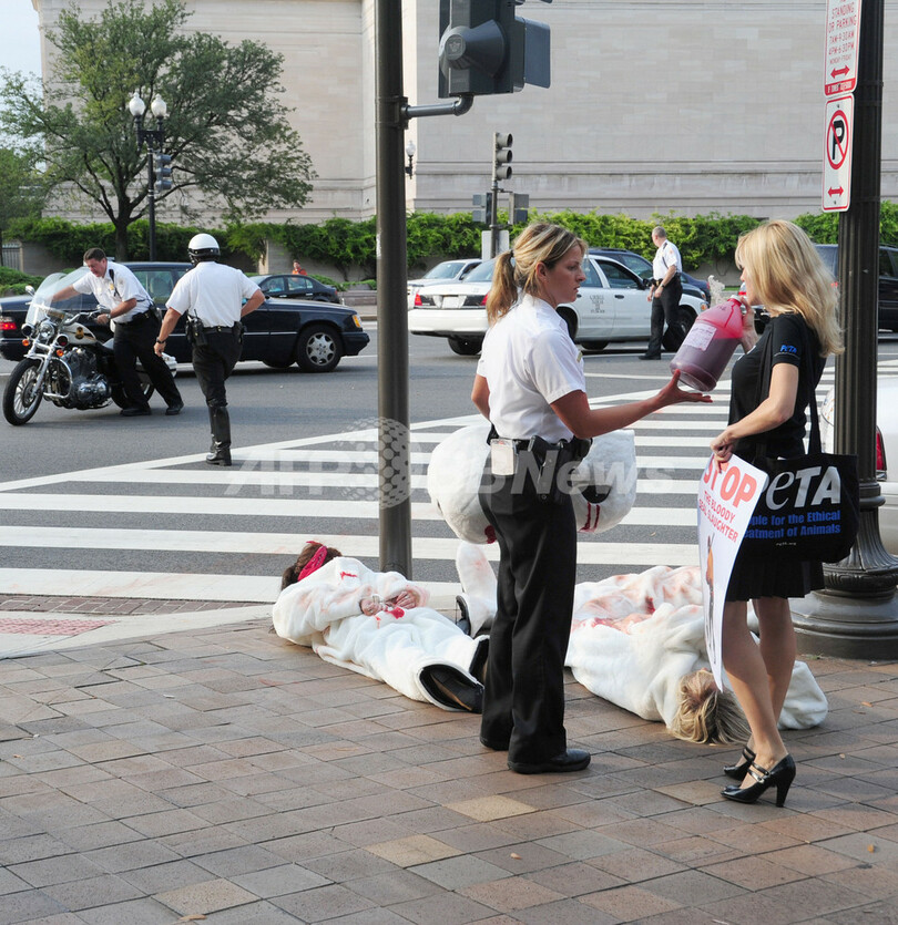【9月19日 AFP】バラク・オバマ(Barack Obama)米大統領がカナダのスティーブン・ハーパー(Stephen Harper)首相と会談した16日、ワシントンD.C.(Washington D.C.)のペンシルベニア通り(Pennsylvania Avenue)のカナダ大使館前では、カナダのアザラシ漁に反対する国際動物愛護団体「動物の倫理的扱いを求める人々の会(People for the Ethical Treatment of Animals、PETA)」が抗議活動を展開。「ハーパー、アザラシ殺しを止めろ」などと書いたプラカードを掲げ、血まみれの赤ちゃんアザラシの着ぐるみを着てパフォーマンスを行った。(c)AFP