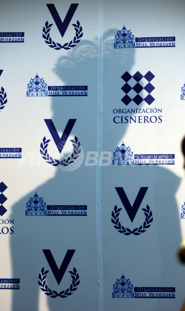 今年のミス・ユニバース(Miss Universe)に選ばれたベネズエラのステファニア・フェルナンデス(Stefania Fernandez)さんが19日、大会後初めて帰国し、会見を開いた。写真は、会見場の壁に映ったフェルナンデスさんの影(2009年9月19日撮影)。(c)AFP/Juan BARRETO