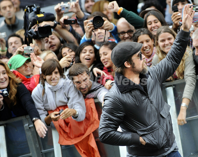 写真は、ファンの声援に応えるピット(2009年9月18日撮影)。(c)AFP/Rafa Rivas