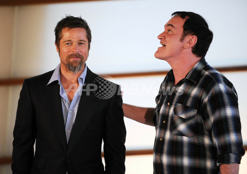 写真は、フォトコールに登場したピット(左)とタランティーノ監督(2009年9月18日撮影)。(c)AFP/Rafa Rivas