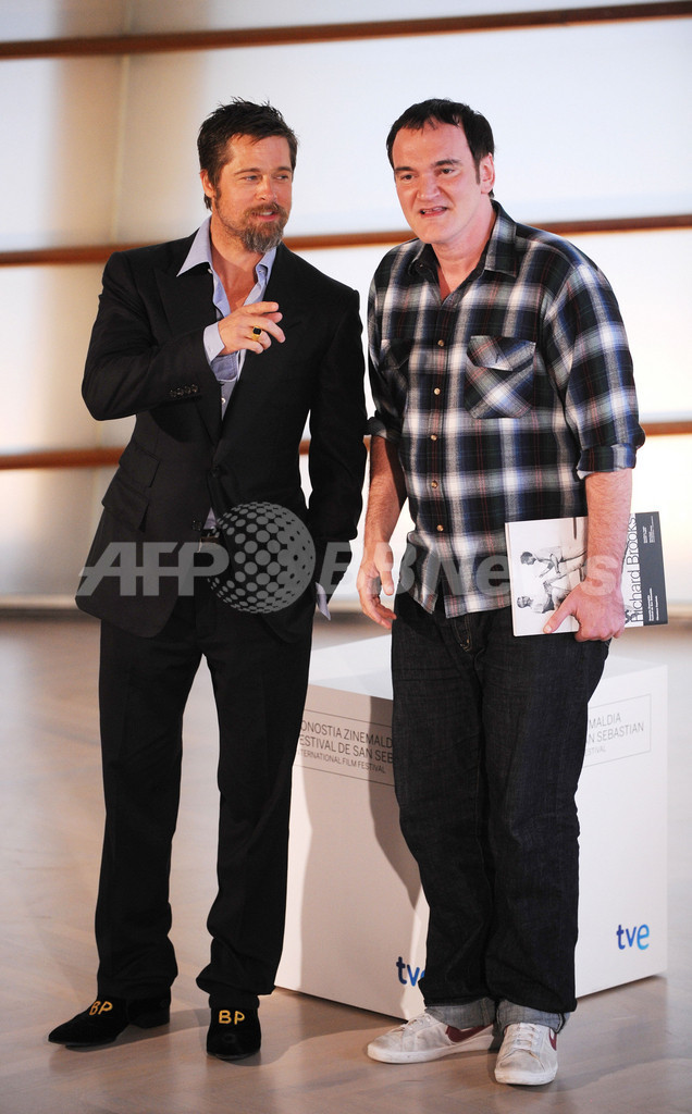 写真は、フォトコールに登場したピット(左)とタランティーノ監督(2009年9月18日撮影)。(c)AFP/Rafa Rivas