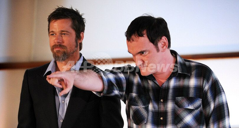 写真は、フォトコールに登場したピット(左)とタランティーノ監督(2009年9月18日撮影)。(c)AFP/Rafa Rivas