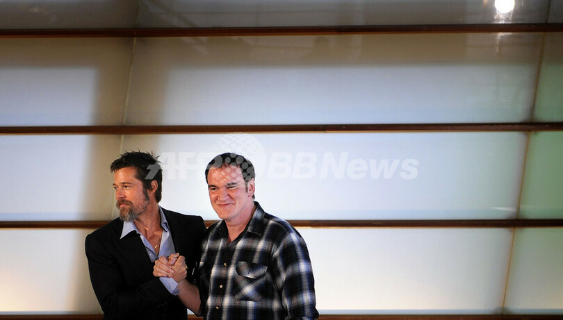 写真は、フォトコールに登場したピット(左)とタランティーノ監督(2009年9月18日撮影)。(c)AFP/Rafa Rivas