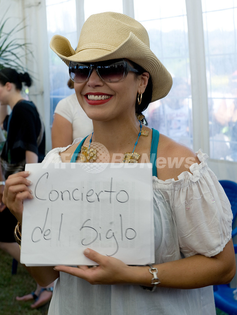 写真は、「世紀のコンサート」と書いたカードを見せるプエルトリコ人歌手オルガ・タニョン(Olga Tanon)さん(右、2009年9月19日撮影)。(c)AFP/ADALBERTO ROQUE