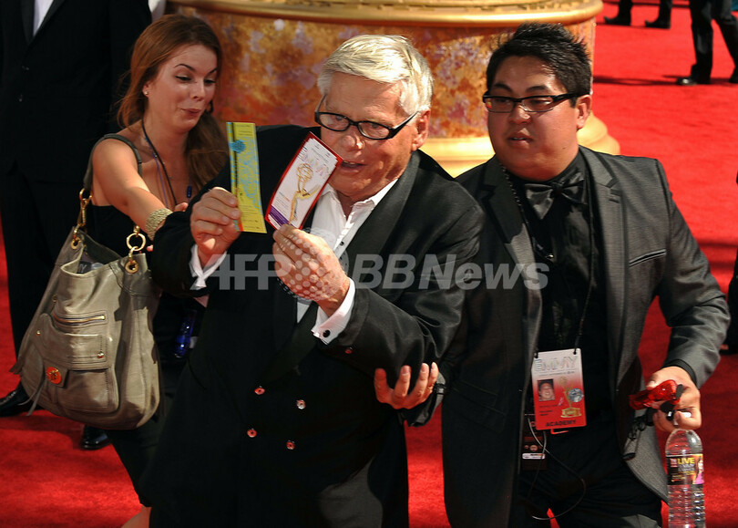 第61回プライムタイム・エミー賞(Primetime Emmy Awards)授賞式が20日、米カリフォルニア(California)州ロサンゼルス(Los Angeles)で開催された。写真は、レッドカーペットで自分のチケットを見せる俳優ロバート・モース(Robert Morse、2009年9月20日撮影)。(c)AFP/Robyn BECK