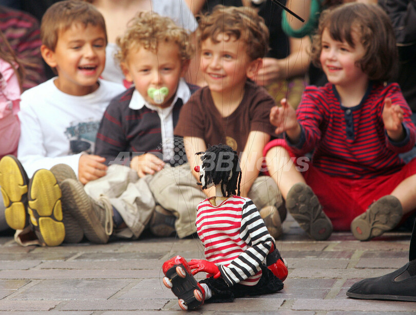 写真は、シャルルビルメジエールの路上で、人形師が操るパペットを見学する子どもたち(2009年9月18日撮影)。(c)AFP/FRANCOIS NASCIMBENI