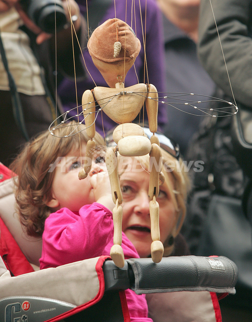 写真は、シャルルビルメジエールの路上で、人形師が操るパペットを見学する子どもたち(2009年9月18日撮影)。(c)AFP/FRANCOIS NASCIMBENI