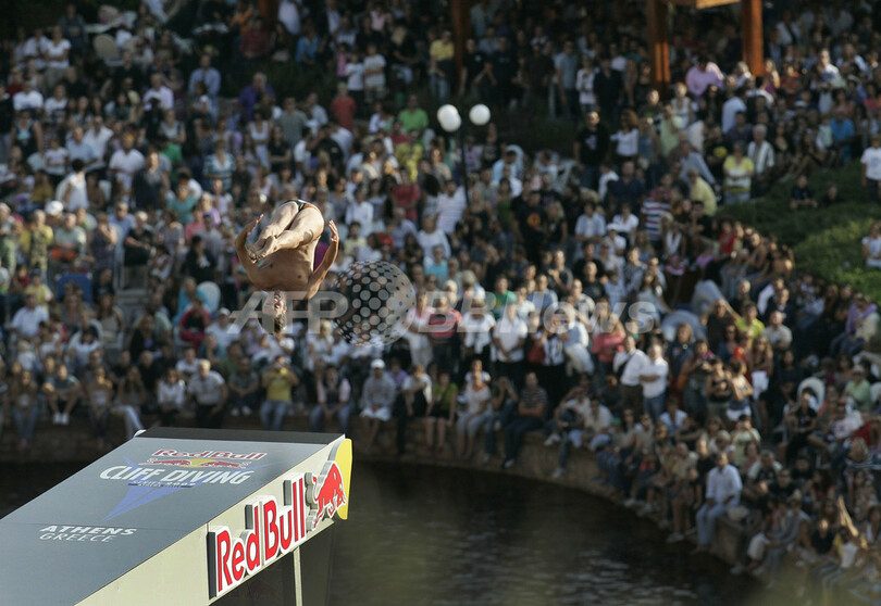 【9月21日 AFP】ギリシャのリゾート地、ブリアグメニ(Vouliagmeni)で飲料メーカー、レッドブル(Red Bull)主催の飛び込みコンテスト「レッドブル・クリフ・ダイビング(Red Bull Cliff Diving)」が開催され、参加者たちは高さ26.5メートルの飛び込み台からのダイブを競った。世界王者オーランド・デュケ(Orlando Duque、コロンビア)に、ゲーリー・ハント(Gary Hunt、英)が迫ったが、最後はデュケが競り勝ち、優勝した。(c)AFP