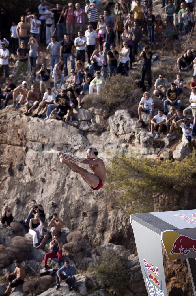 【9月21日 AFP】ギリシャのリゾート地、ブリアグメニ(Vouliagmeni)で飲料メーカー、レッドブル(Red Bull)主催の飛び込みコンテスト「レッドブル・クリフ・ダイビング(Red Bull Cliff Diving)」が開催され、参加者たちは高さ26.5メートルの飛び込み台からのダイブを競った。世界王者オーランド・デュケ(Orlando Duque、コロンビア)に、ゲーリー・ハント(Gary Hunt、英)が迫ったが、最後はデュケが競り勝ち、優勝した。(c)AFP