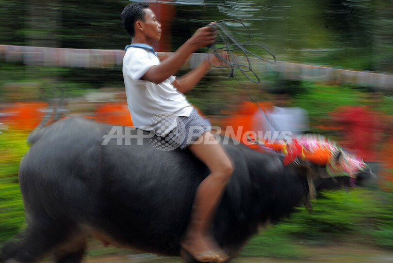 写真は、カンボジア・カンダル(Kandal)州Vihear Sour村で開かれた水牛レース(2009年9月19日撮影)。(c)AFP/TANG CHHIN SOTHY