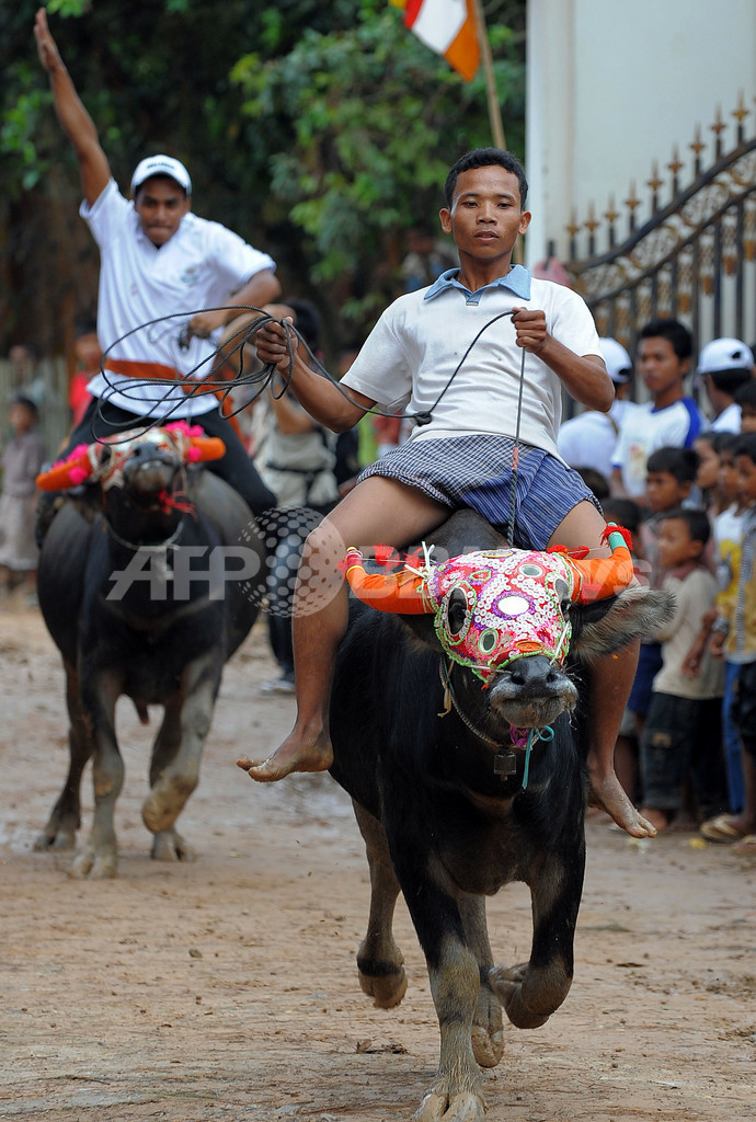 写真は、カンボジア・カンダル(Kandal)州Vihear Sour村で開かれた水牛レース(2009年9月19日撮影)。(c)AFP/TANG CHHIN SOTHY