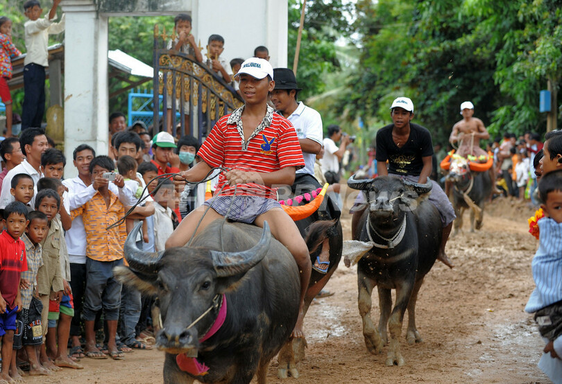 写真は、カンボジア・カンダル(Kandal)州Vihear Sour村で開かれた水牛レース(2009年9月19日撮影)。(c)AFP/TANG CHHIN SOTHY