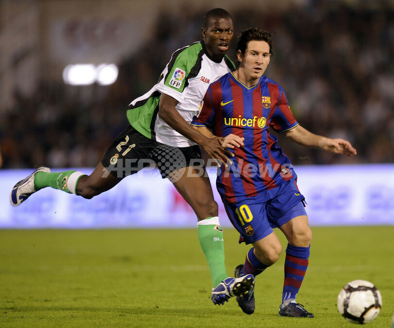 バルセロナは、リオネル・メッシ(%%Lionel Messi%%)が2得点、ズラタン・イブラヒモビッチ(%%Zlatan Ibrahimovic%%)が1得点を記録し、開幕からの連勝を4とした。バルセロナの開幕4連勝は1997-98シーズン以来初めて。写真はラシン・サンタンデールのパパクリ・ディオプ(%%Papa Kouli Diop%%)をかわすバルセロナのリオネル・メッシ(右)。(2009年9月22日撮影)(c)AFP/A. ARRIZURIETA