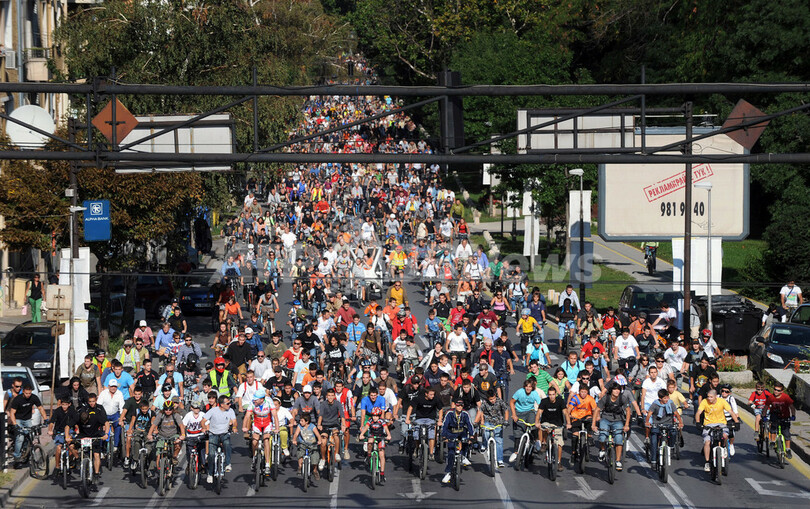 写真は、ブルガリアの首都ソフィア(Sofia)で行われたイベント「カーフリーデー(World Carfree Day)」で、自転車に乗る数千人の参加者(2009年9月22日撮影)。(c)AFP/DIMITAR DILKOFF