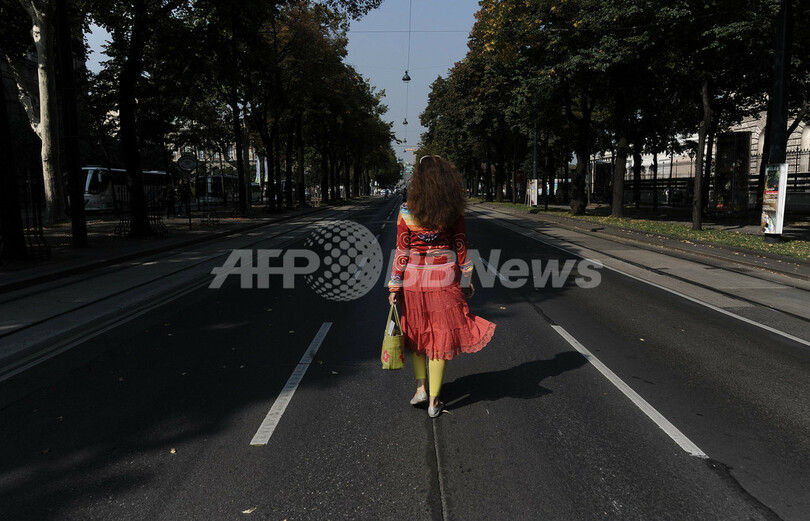 写真は、オーストリアの首都ウィーン(Vienna)で「カーフリーデー」のために8時間の通行止めが始まったリング通り(Burg Ring)を歩く女性(2009年9月22日撮影)。(c)AFP/Joe KLAMAR
